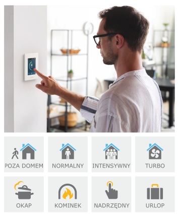 - Kontrola przepływu powietrza zgodnie z poziomem jakości powietrza, CO2 , wilgotności RH.